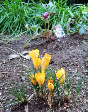 小型の球根草花クロッカスが早春の日を受けて、花開いています。