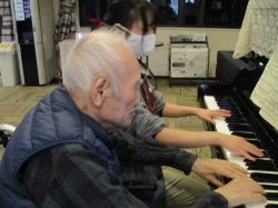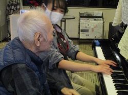 グリーンライフの1Fのラウンジでは、何やら楽しそうにスタッフと一緒にピアノを弾いている姿が・・・