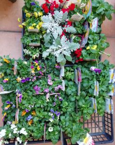 最初にバスケットに軽石を入れて、土を中程まで加えます。1つのバスケットにパンジーと白妙菊、アリッサムの花苗を5苗を植え込みました。