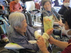 お誕生日会の中盤に差しかかり、緊張の趣きで、ケアスタッフ、看護スタッフの2人が、