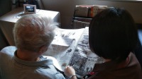 入居者様が新聞をお読みになりながら、リラックスタイムを過ごしています。
