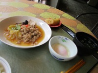 お皿に盛られた肉と豆腐、半熟卵と