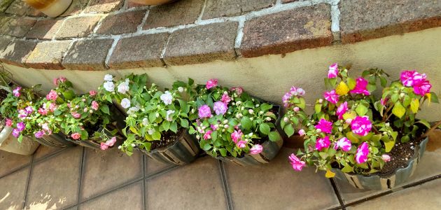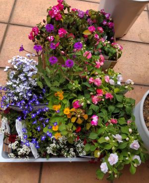 玄関にハンギングバスケットを飾っていますが、日陰でも育つ花を選んでいます。