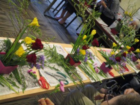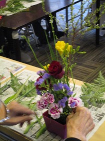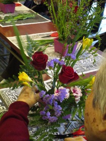 背の高い”ネコヤナギ”、渋~い赤色の”バラ”、黄色の”フリージア”、”カーネーション”、紫色の”スターチス”等々。