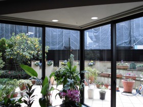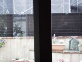 先日、餌箱を設置した中庭のフェンスの上に小鳥がやって来ております。