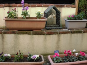 そこで、いつも中庭の手入れをしておりますスタッフが、「めじろ」のえさ箱を用意いたしました。