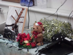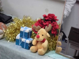 今月はクリスマスですので、サンタ姿の熊さんとトナカイを鏡の横に置いて理美容です。