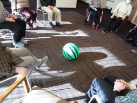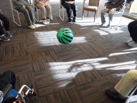 5階のラウンジで、皆さんで輪になってビーチボールを蹴ります。