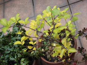 黄色く色付いている鉢の葉っぱは何でしょう???