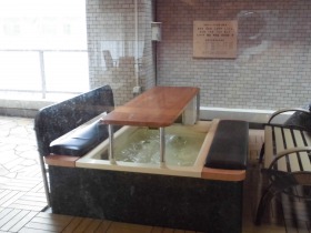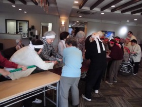 長テーブルを4つ並べ、白組と紅組に別れ綱を引きます。