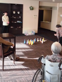 今回は、ボーリングです。可愛いカラフルなピンを20本並べます。