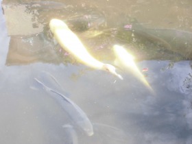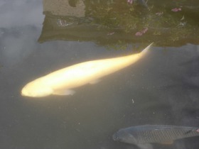 池では、大きな黄金の鯉が泳いでいます。太陽の光で輝いています。