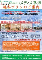 グリーンライフ東日本株式会社では、メディス草津で『越冬プラン』を実施中です。温泉に浸かりたい方、リハビリを頑張りたい方には打ってつけの内容となっています。ご興味のある方は是非グリーンライフ船橋までご連絡ください。