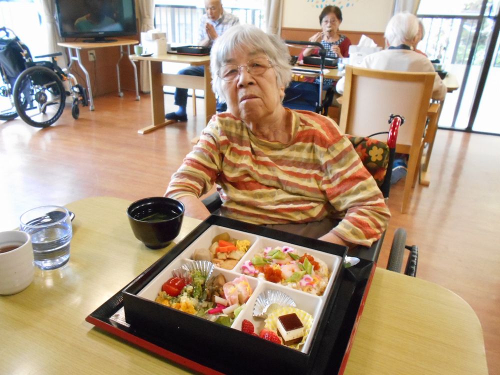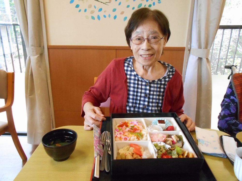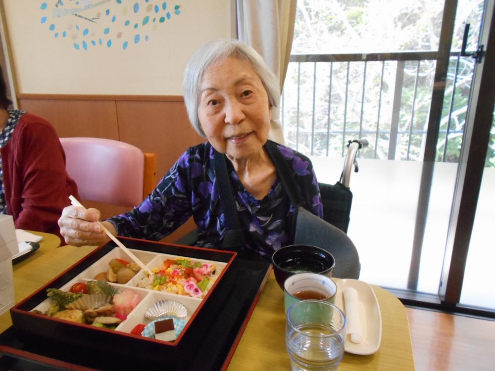 メニューは、ちらし寿司・天婦羅・鰆西京焼き・さくらシューマイ・若鶏三色巻・炊き合わせ(里芋、筍、ふきなど)、ミニケーキetc