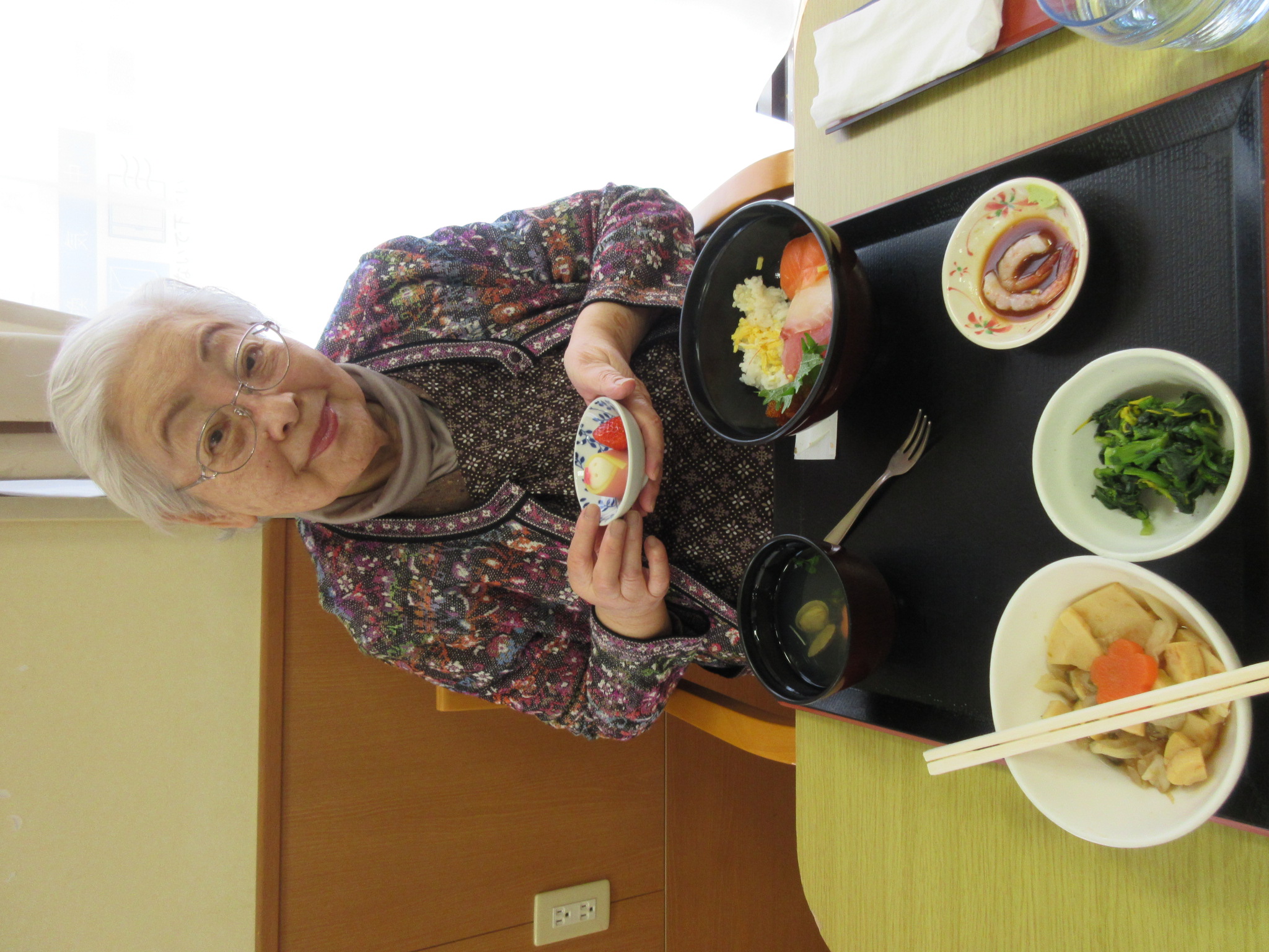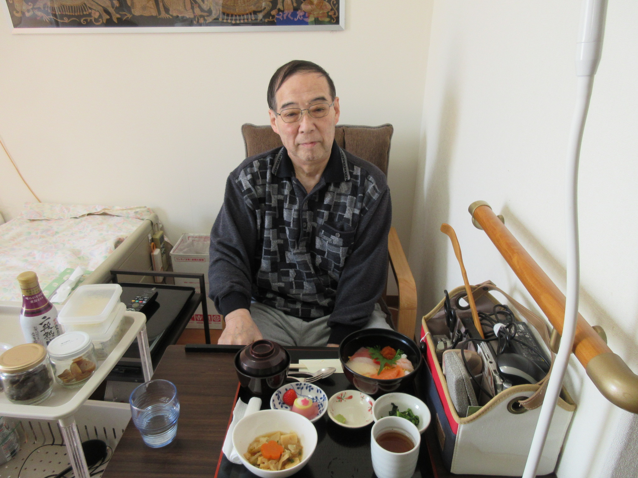 昼食は、生ちらし、すまし汁、菜の花のからし和え、筍とキャベツのおかか煮等、おやつは、六花亭の桜餅です!