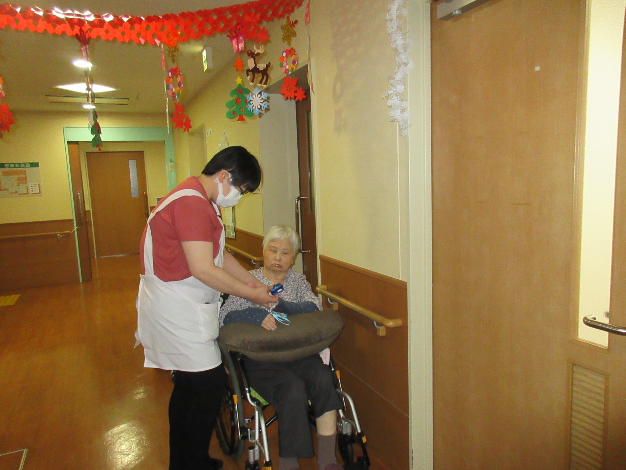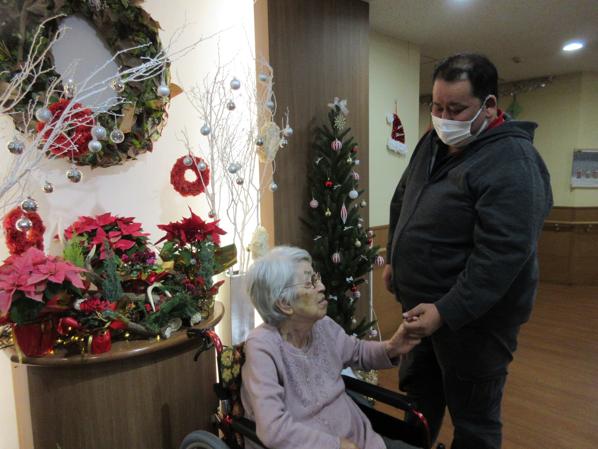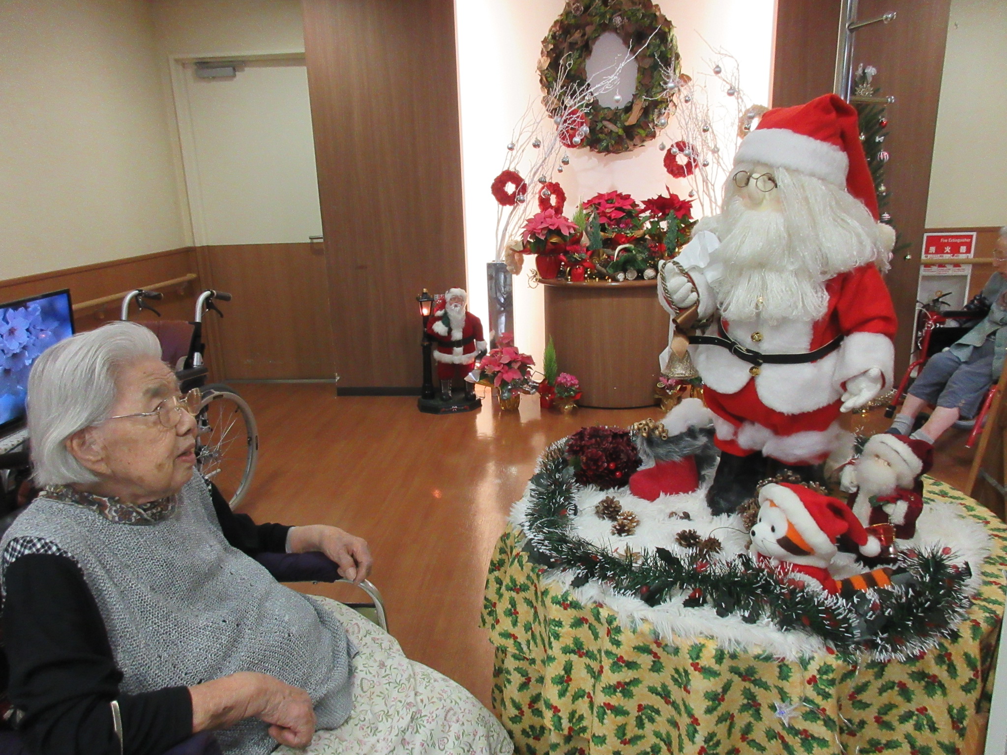 今日は玄関先に飾っているサンタを見に入居者さまがいらっしゃいました。