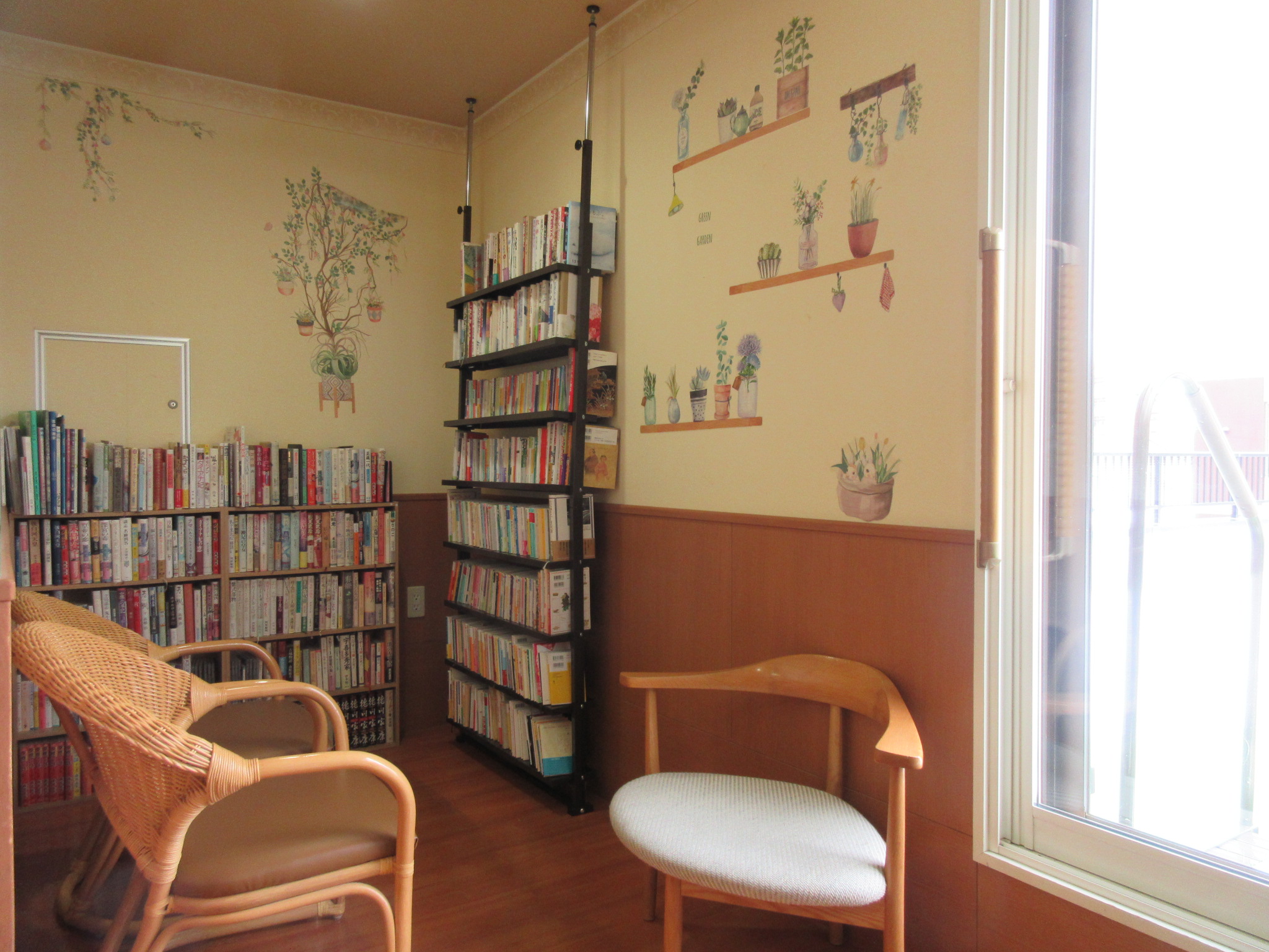 施設にある図書コーナーは、日当たりが良くイスも多めに置いてあるので皆さんの交流の場となっていますが、本好きの方ももちろん集まります