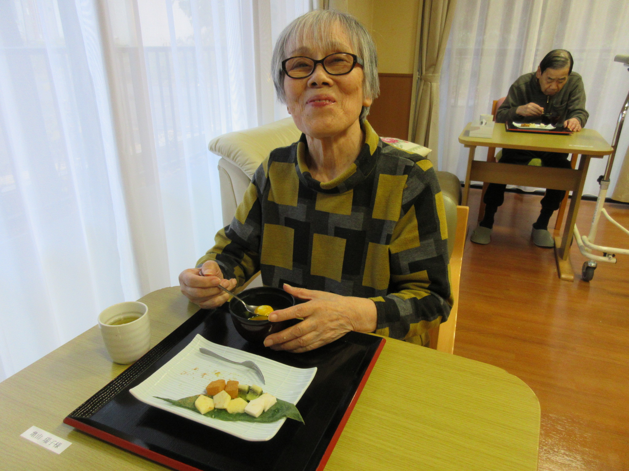 今回はカボチャのお汁粉、わらび餅、キウイフルーツ、リンゴ、わた羊羹の盛り合わせでした。