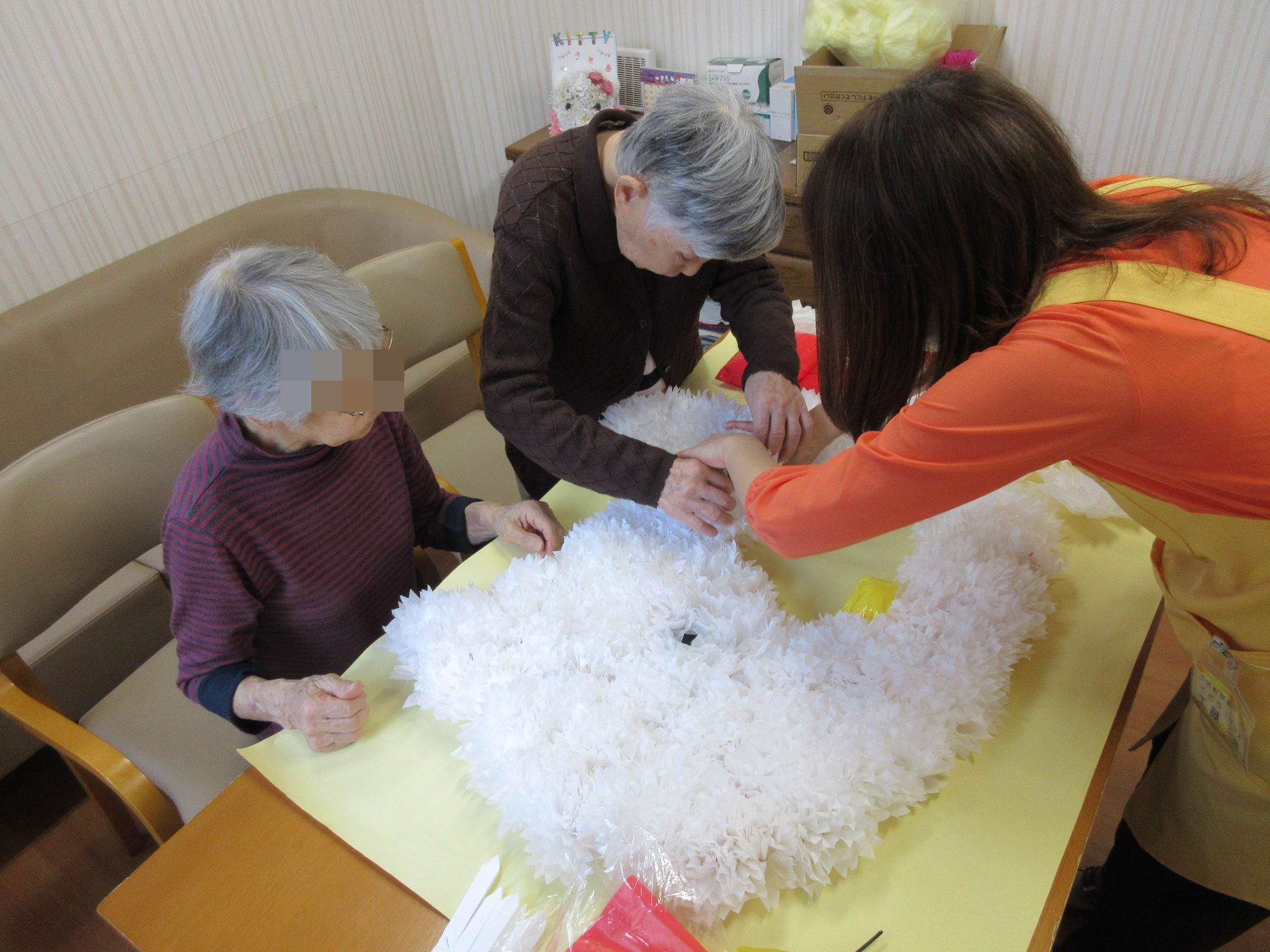 施設のキャラクターであるキティちゃんに関わる”なにか”を職員が手作りしなければならなく・・・、ペーパーフラワーで作成したものの他にも一生懸命作ったモノがあります