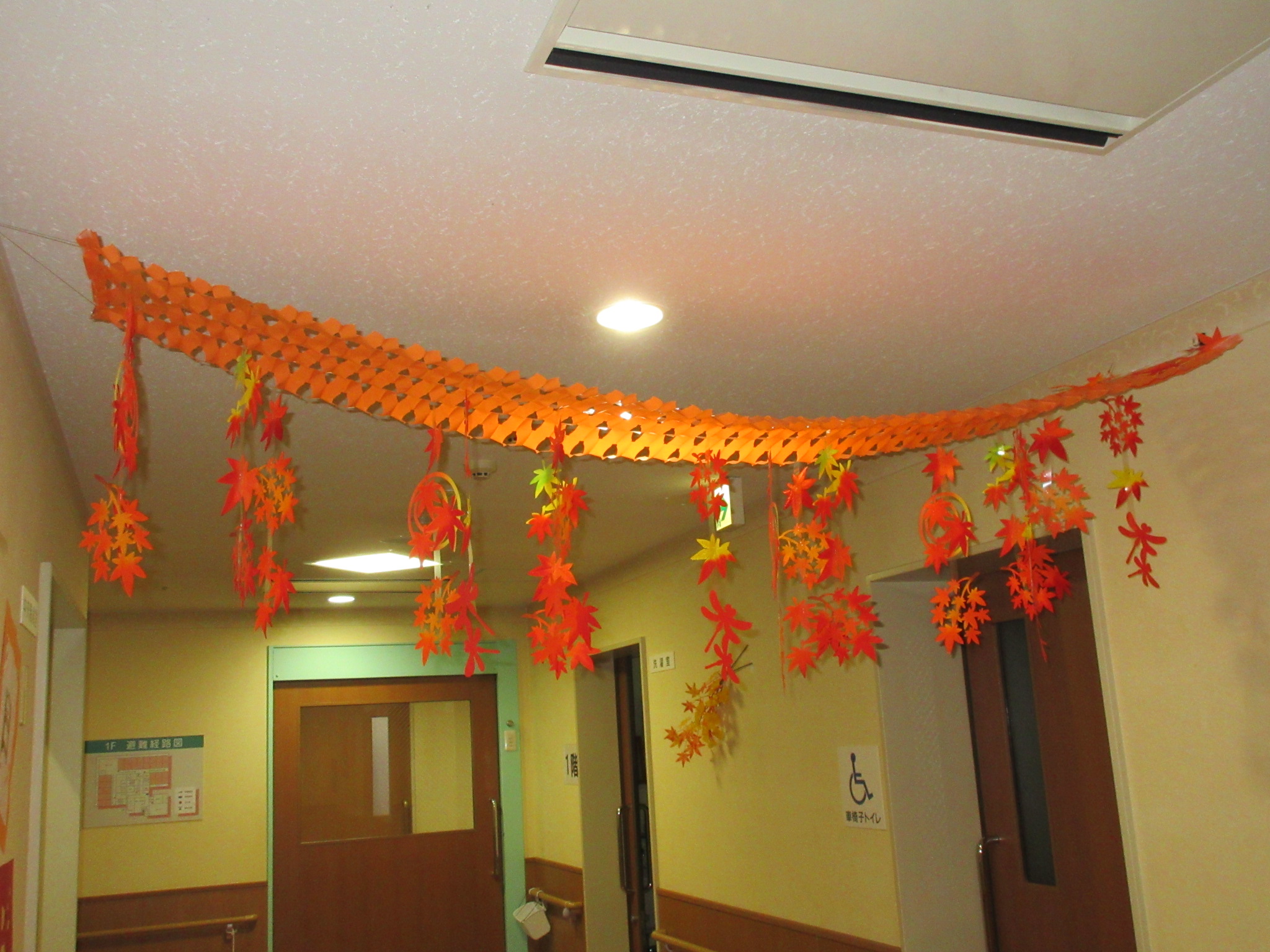 18日に敬老会が行われますが、それに向けて事務所や各フロアでは飾りつけを