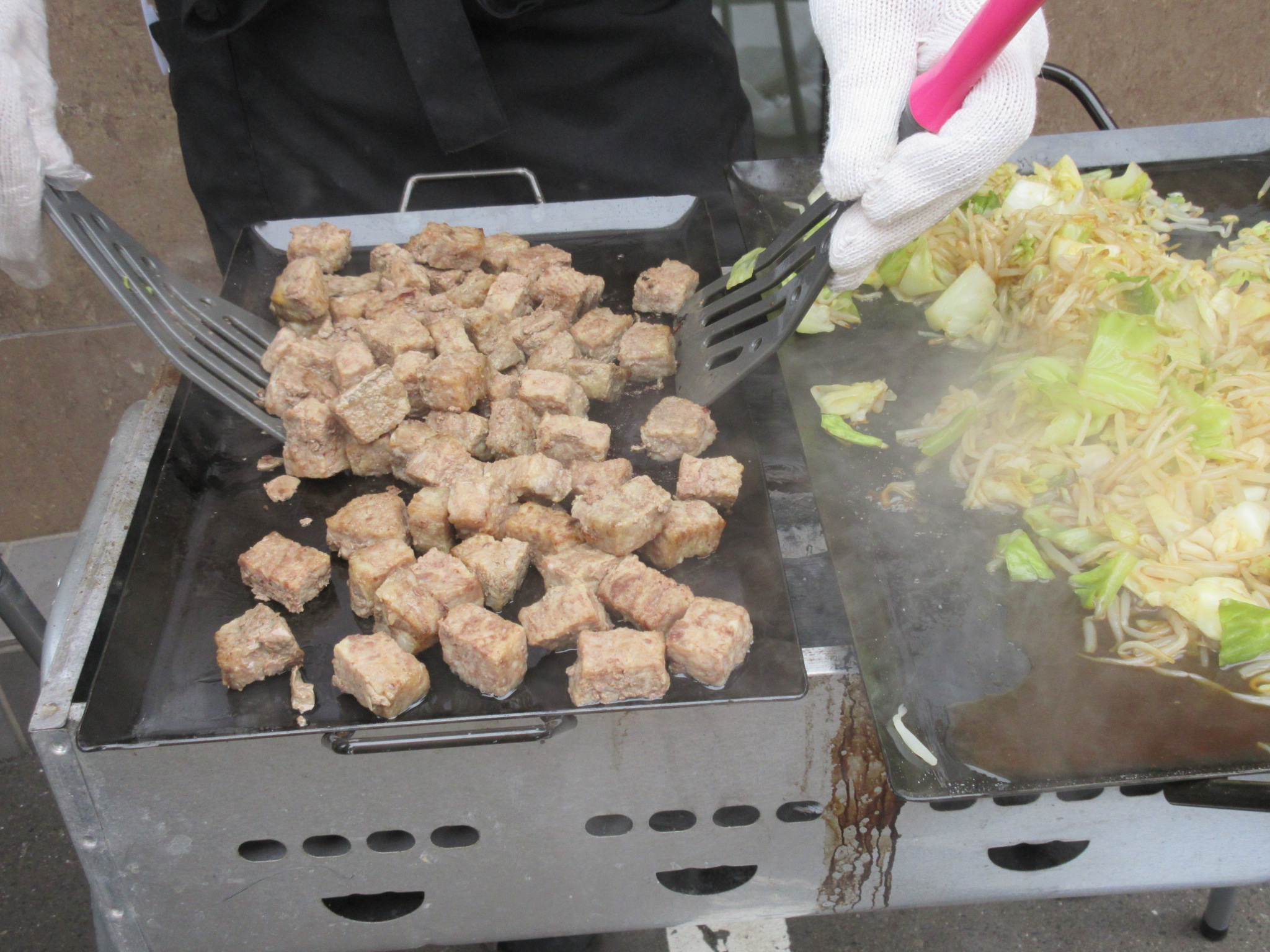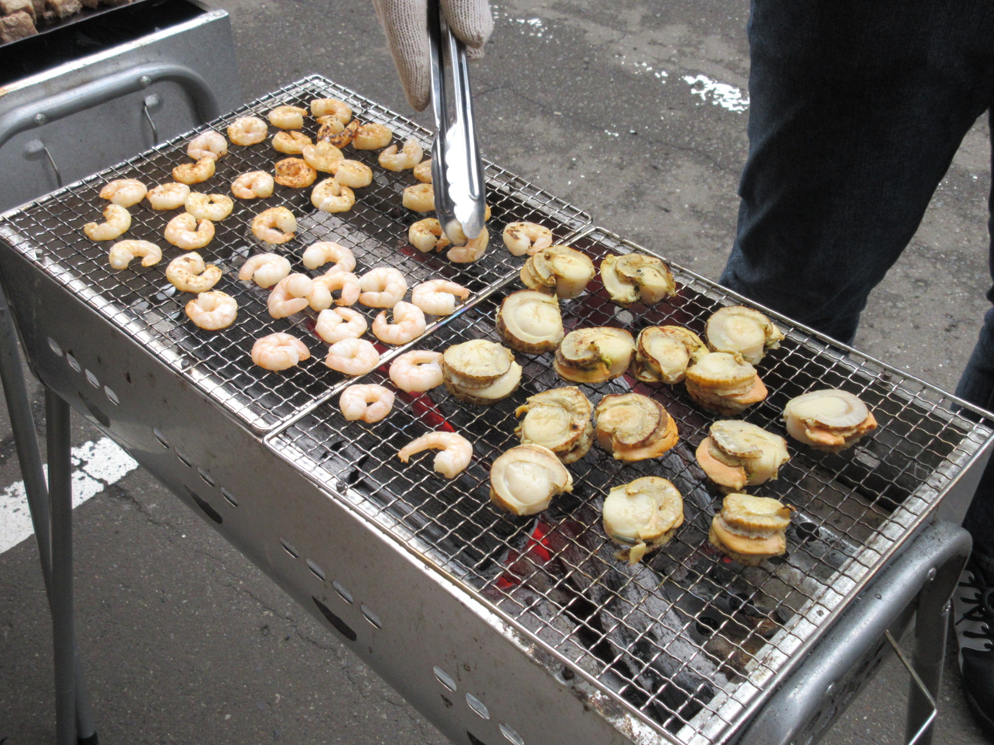サイコロステーキ、つくね、ウインナー、アスパラ、カボチャ、海老にホタテ、スイカ
