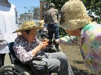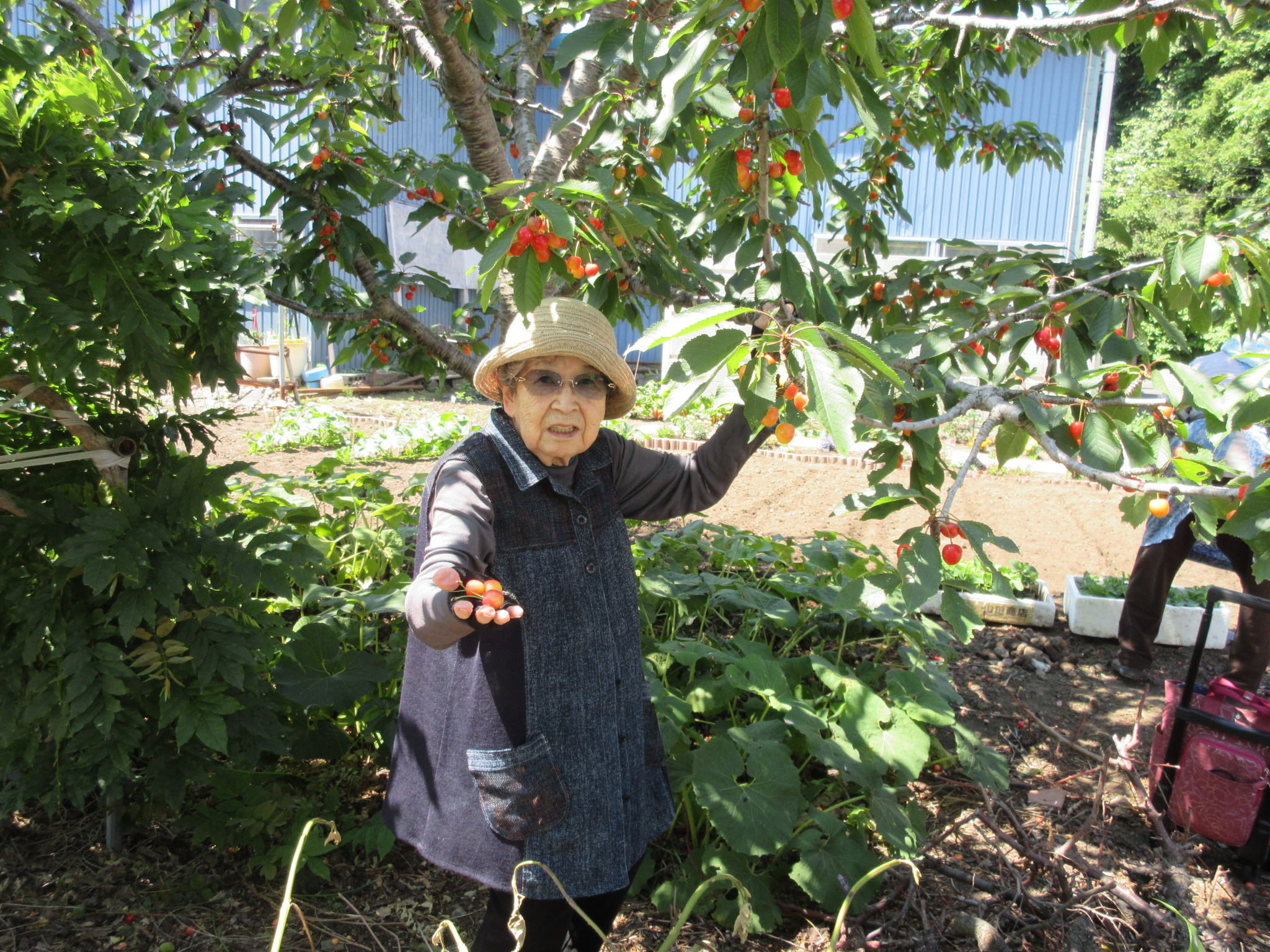 車椅子のため近くまで行けない奥様のために取って差し上げる優しいご主人、美味しすぎるがゆえ流れる涙をサクランボで演出する(笑)ユニークな方・・