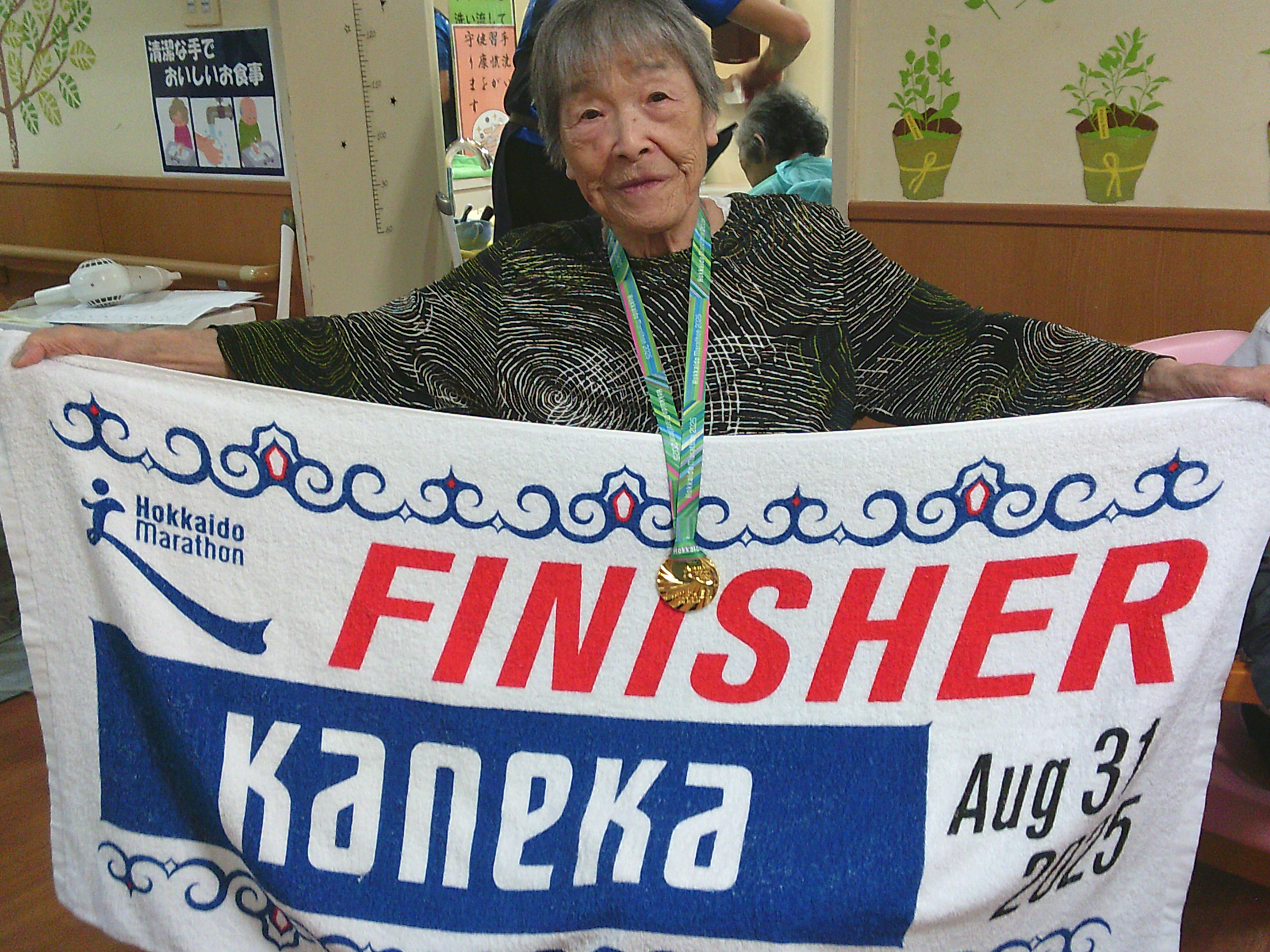伏見の職員も参加しましたよ~記念のメダルとタオルを入居者様にも見てもらっていました。
