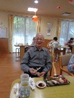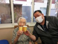 先日100歳のお誕生日を迎えた入居者様が座っていました。一緒にお茶で乾杯(≧▽≦)
