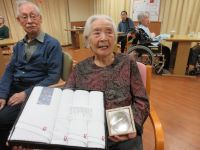 先月100歳を迎えた入居者様に総理大臣から賞状と銀杯が届きました。