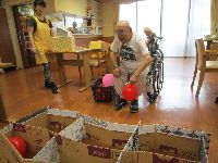 段ボールで作った得点の箱にめがけて