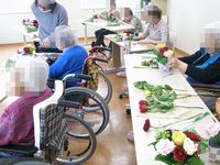 写真はナースと談笑しながら順番を待つ入居者様です。