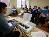 高い声を出す時の姿勢を教わったり、歌い出しは先生の合図を見逃さないで!と、皆さまは楽譜を見ているので照れ笑い♪