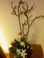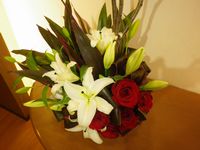 カサブランカに赤い薔薇そして枝に小さな可愛い