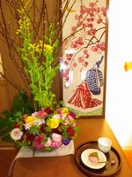 雛段飾りに合うように桃の花のアレンジメントフラワーが届きました。