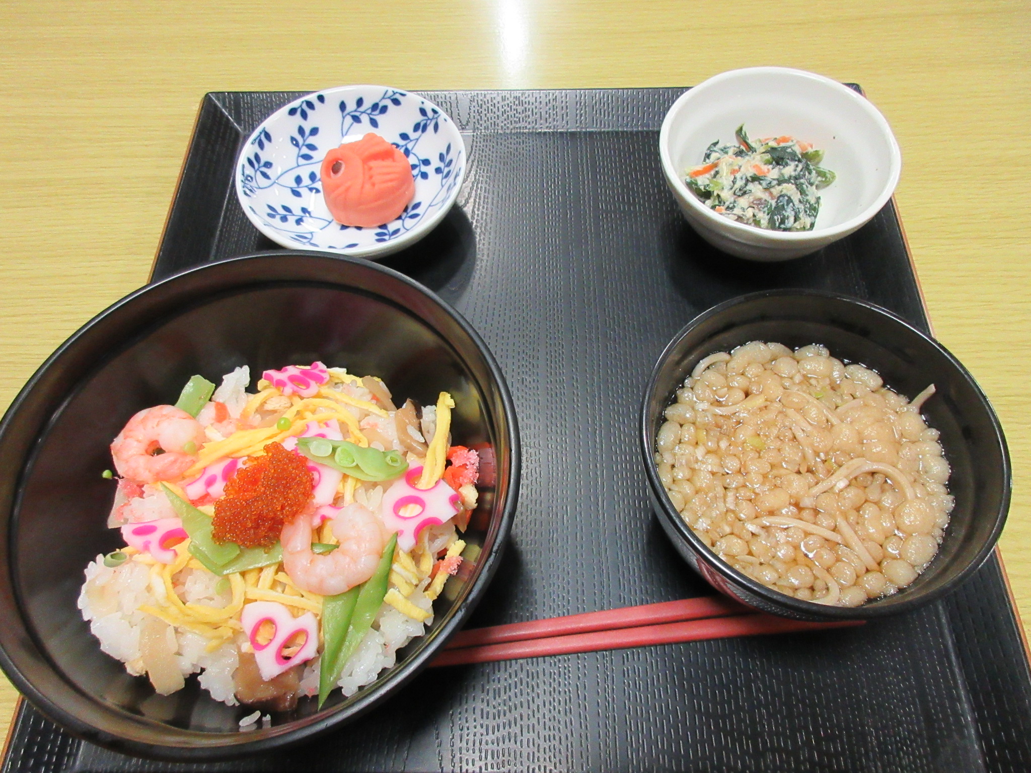 夕食メニューはちらし寿司、年越しそば、白和え、練り切り。