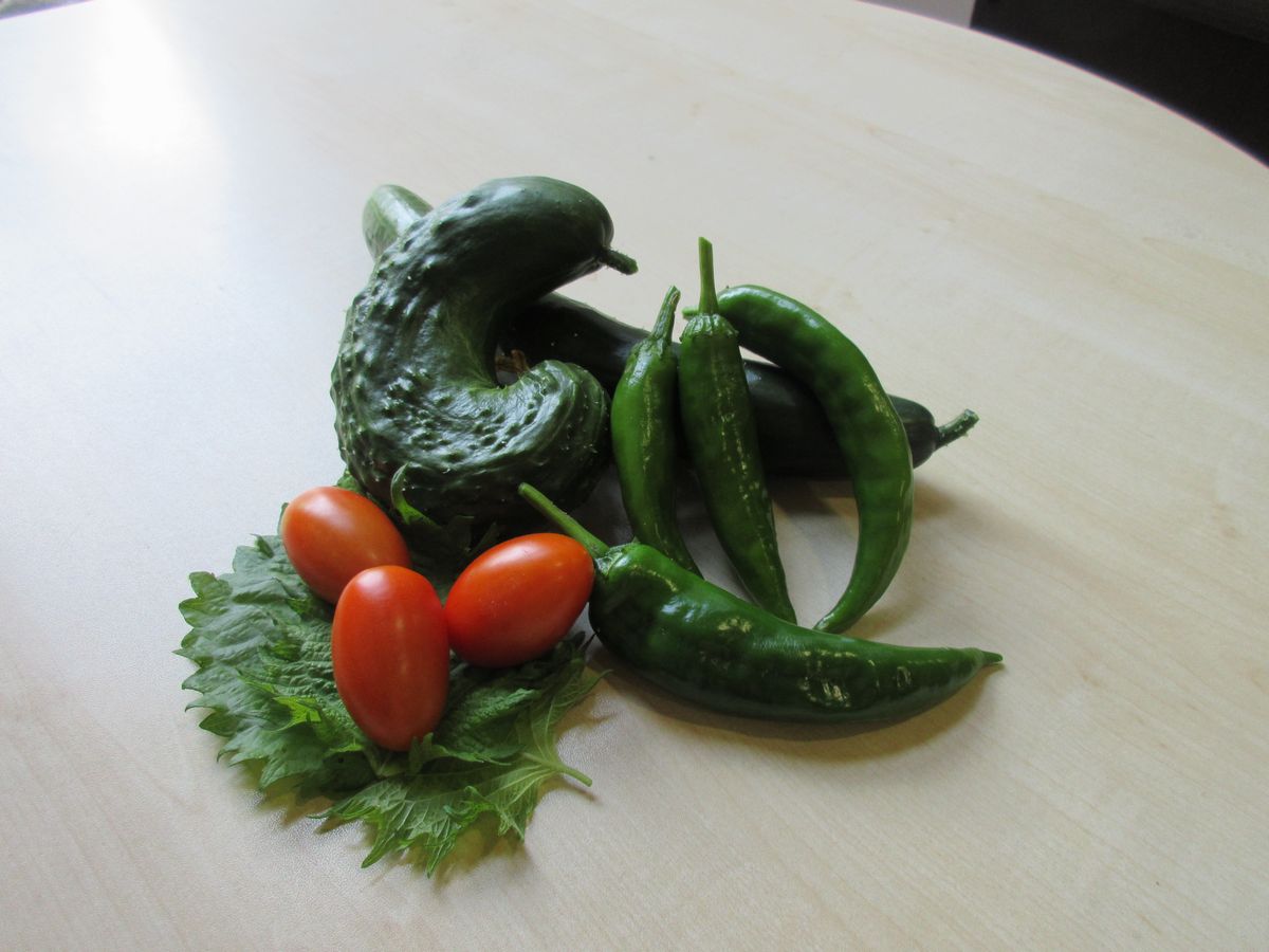 今日はきゅうり2本、ミニトマト、シソ、しし唐を収穫、