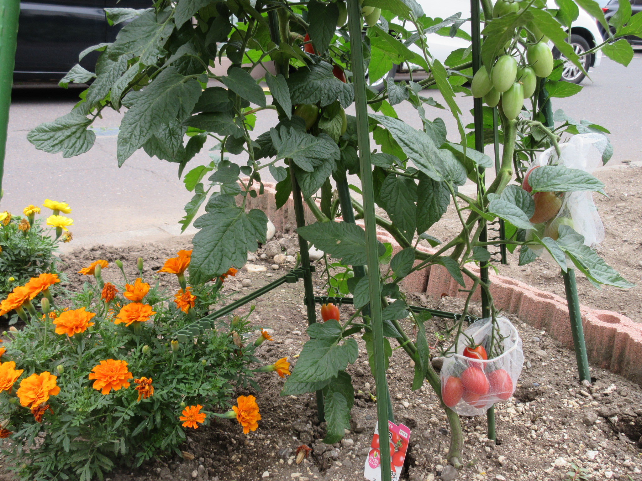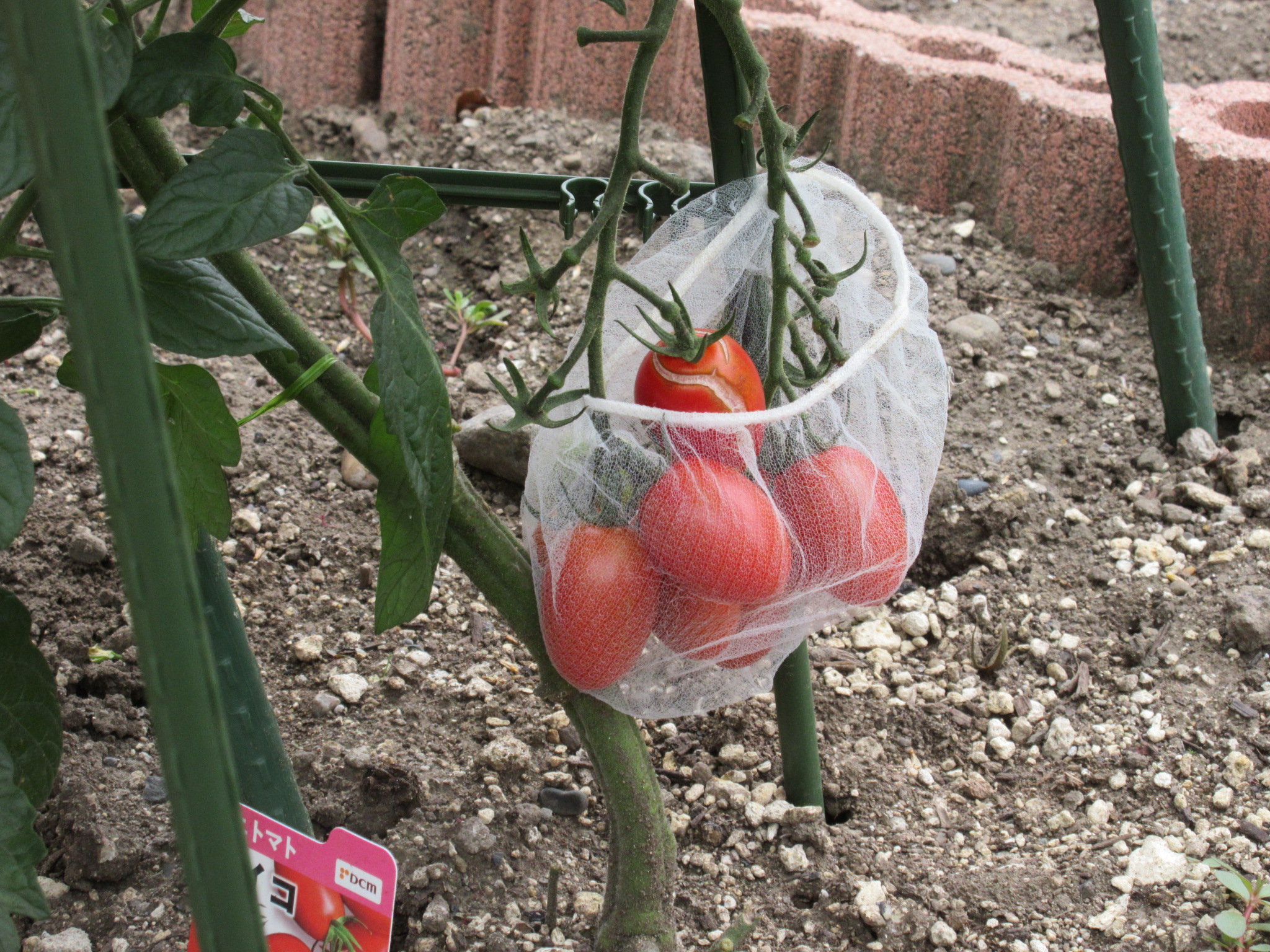 トマトも丸々と太った実が出来、落ちないようにカバーを着けました