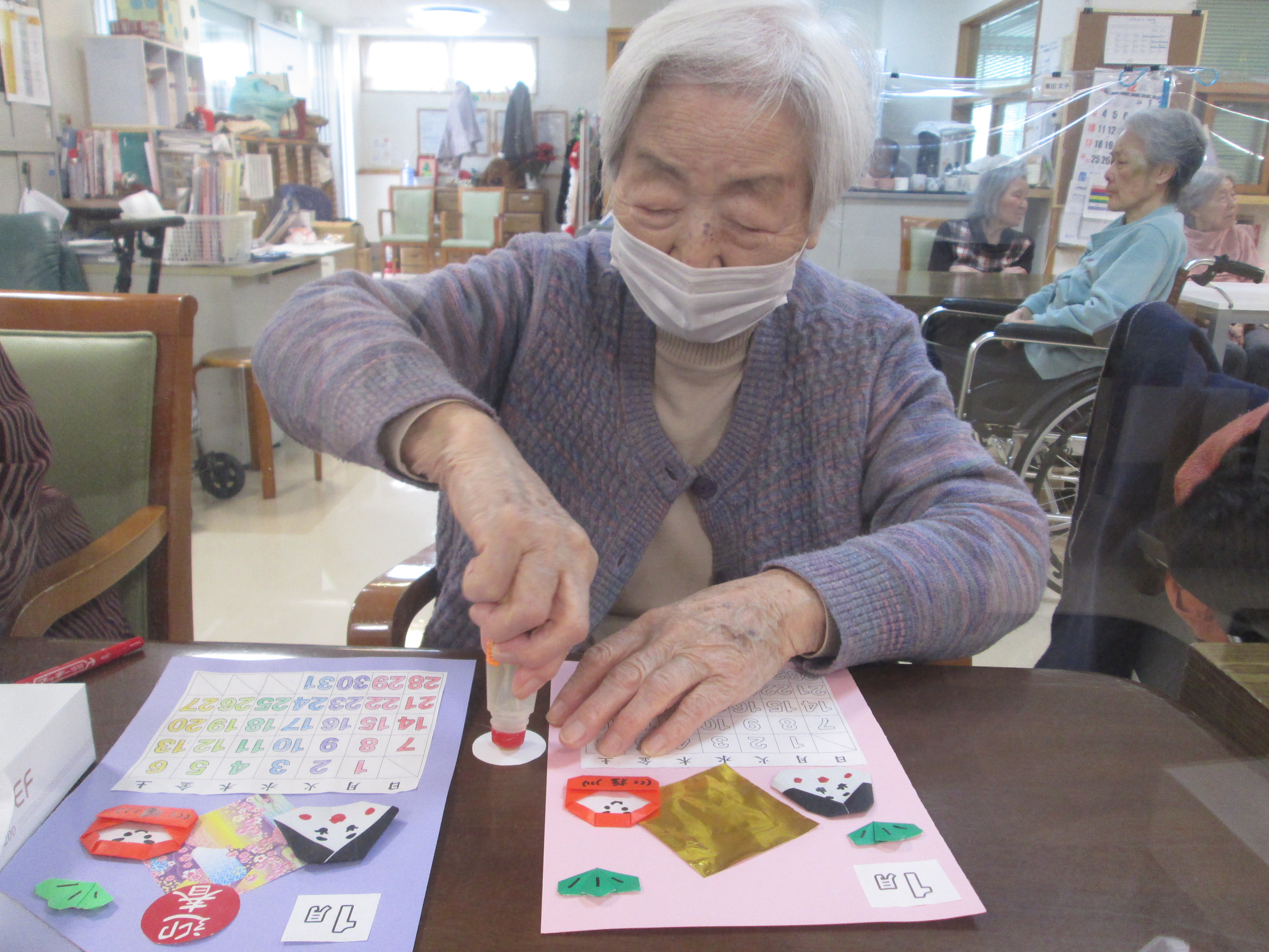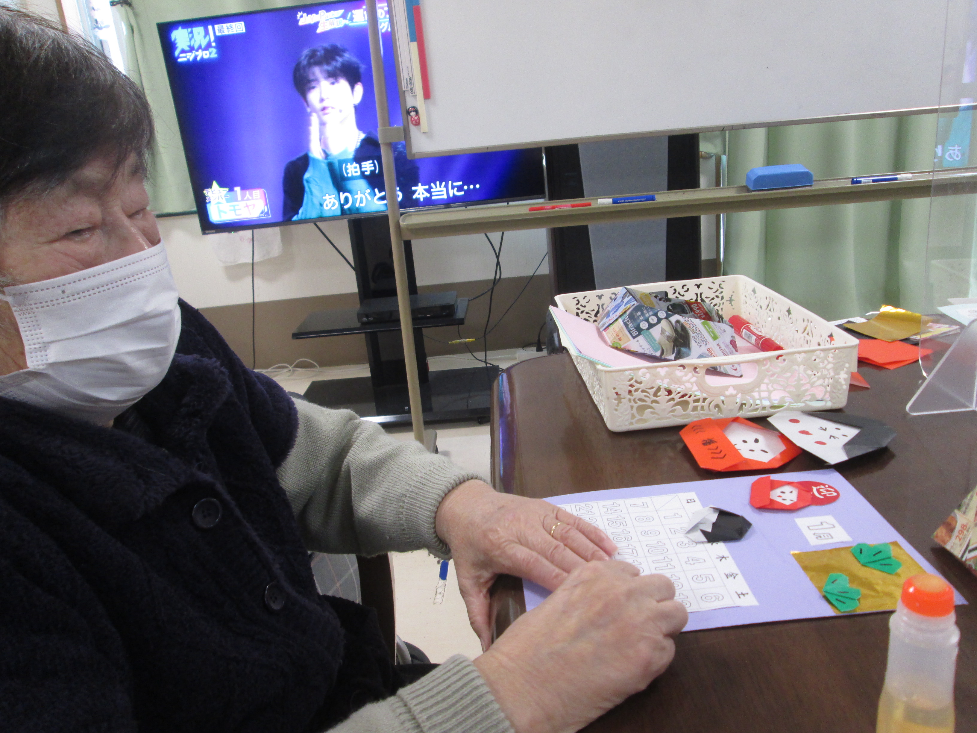 こんにちは、デイサービスです。本日は1月のカレンダー制作ということで、だるまとおかめを折り紙で折っていただき顔を描きました。1月のカレンダーは新年の始まりなので華やかになるよう余白には折り紙で作った松や迎春、金や和柄の折り紙を貼りつけました。おかめやだるまの顔は利用者様方に描いていただきましたが、それぞれ個性的な表情でとても可愛らしいものになったと思います(^O^)!