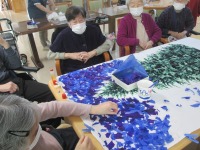 こんにちは、デイサービスです。今日は来月の壁面をかざる予定のモミの木のタペストリーの飾り付けを行いました。白地の布にはすでにモミの木が描かれているのでその周りをおはながみを貼りつけて夜空を表現します。木工ボンドを水に溶かして、白地の部分に液体をたっぷりつけたら、細かくちぎったおはながみを載せて貼りつけます。1時間しっかり取り組んでいただきましたが、まだまだ時間がかかりそうです(-_-;)この後は綿で雪を表現してツリーにデコレーションをしたら完成となりまーす(^_^)
