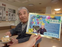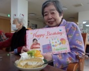 ゲームが終わった後は11月生まれのご利用者様のお誕生日会を行いました。皆でハッピーバースデーの歌を歌って、職員手作りのお誕生日カードをプレゼントさせて頂きました。「こんな歳になって皆さんに祝って頂けて嬉しいです」とお礼のスピーチをいただきました。