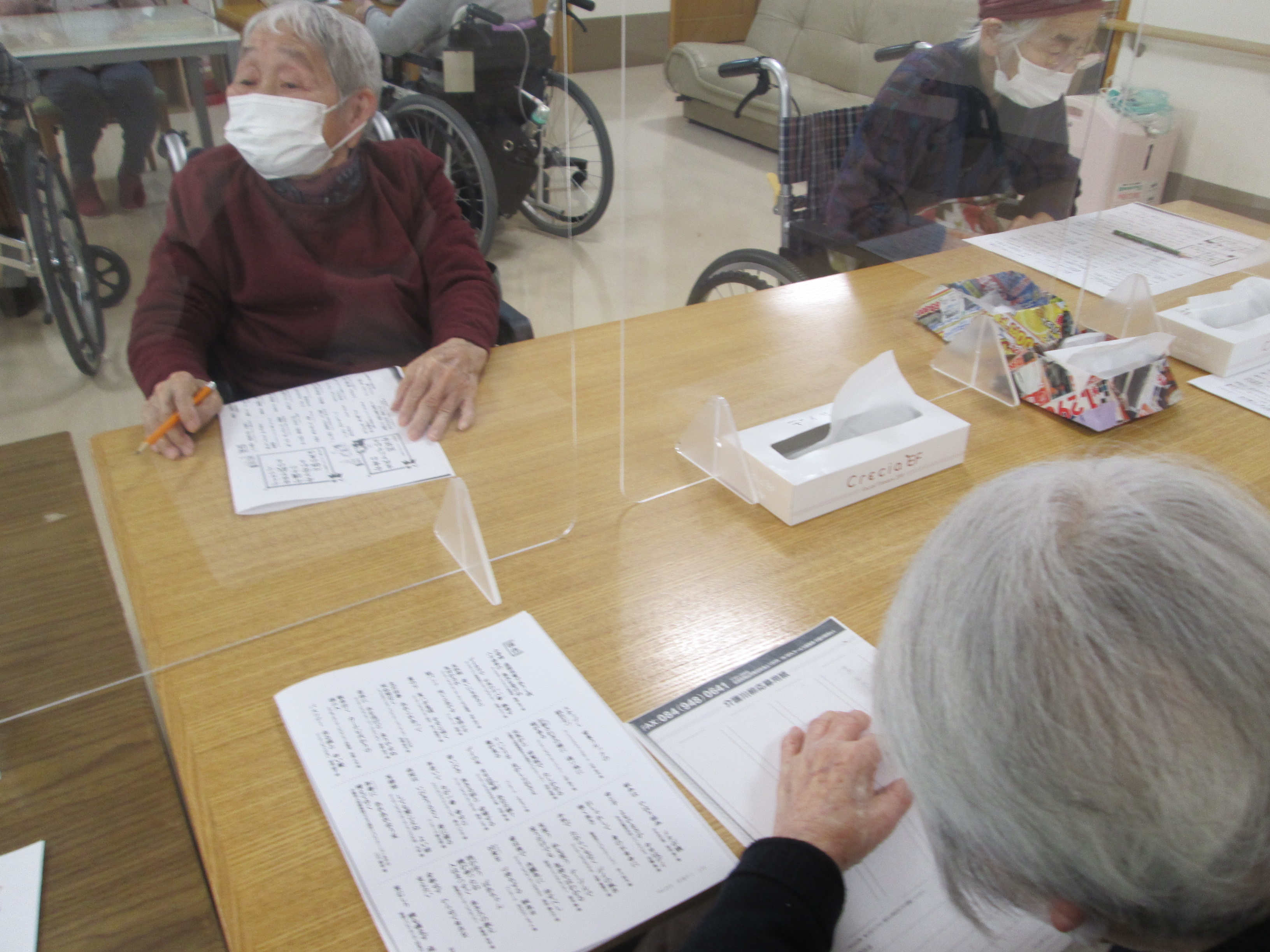 こんにちは、デイサービスです。本日のレクリエーションではいつもの脳トレとは少し種類を変え、絵合わせとひらがな文字探しの脳トレを行いました。絵合わせ脳トレでは、はじめは「みんな一緒に見えるよ」「印刷間違いじゃない?」など声が上がりましたが、よーく絵を見比べると柄の左右が違ったり、上手く合わさらない絵柄などが見えたりしてきました。1つ見つかると皆さん集中して違いを見つけていらっしゃいました。