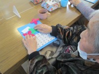 12月といえばクリスマス、ポインセチアの季節ということで、切った折り紙を重ねてポインセチアに見立てています。赤と緑の色の組み合わせを見ると一気にクリスマス感が出て、季節を感じられるカレンダーになったのではと思います。利用者様型からも「この色合いを見ると温かい感じがしていいね」「一気に華やかになる感じがする」と好評をいただきました。(*^_^*)
