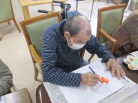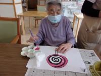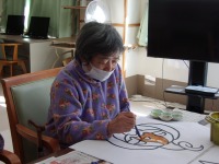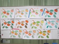 こんにちは、デイサービスです。本日は「柿」をテーマに水彩画を行いました。庭木で植えてる方が多いので外で散歩したり、ドライブ中に見かけることがあります。まじまじと見る機会がないのですが、皆様それぞれ味のある柿や葉の青々としたもの、少し落ちる手前の茶色の葉を描いてくださり、楽しい水彩画の時間を過ごすことができました。