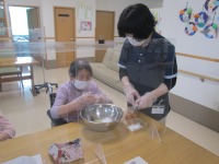 利用者さんには食パンを四等分に切っていただいたり、卵を割り牛乳とを混ぜた液に浸していただいたりして、少し長めに染み込ませたら、バターたっぷりのホットプレートで皆さんと一緒にこんがり焼き目をつけました。