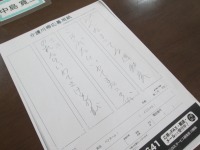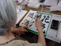 「習っていたの?」「コツを教えて」「いい文字が書けたね」など楽しく会話しながら和やかな雰囲気で行っていましたが、筆を持つその眼はとても真剣です。コツを尋ねると「静かな心で書くんだよ」と教えて頂きました。