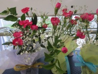 リボンもそれぞれ好きな色を選んで結びました。周囲の方々と「この色がいいかね」「あなたはきれいに生けられているね」などお話も弾みました。植物に触れると心が活き活きしてくるような気持になりますよね。来月も楽しみです。