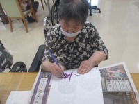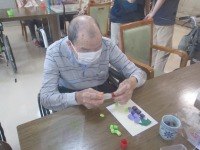 本日のレクは立体ぶどうのポストカードを制作しました。折り紙で作った輪っかを台紙に並べて貼っていくと、あっという間に熟れたぶどうの房が完成。小さな折り紙の輪をぶどうの形を想像して並べて貼っていくのは、普段あまりしない作業で指先もたくさん使います。