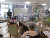 こんにちは、デイサービスです。今日はホワイトボードを使って脳トレレクを行いました。「メロン、フランス、カレー、コロッケ、揚げ」にあって「スイカ、アメリカ、シチュー、とんかつ」にないものは?(正解はパンです。)等のあるなし問題や穴埋め言葉探し問題です。答えはわかった方から挙手をして発表してもらいました。いつものプリントに書きこむ脳トレと違って新鮮だったと嬉しい感想を聞くことができました!