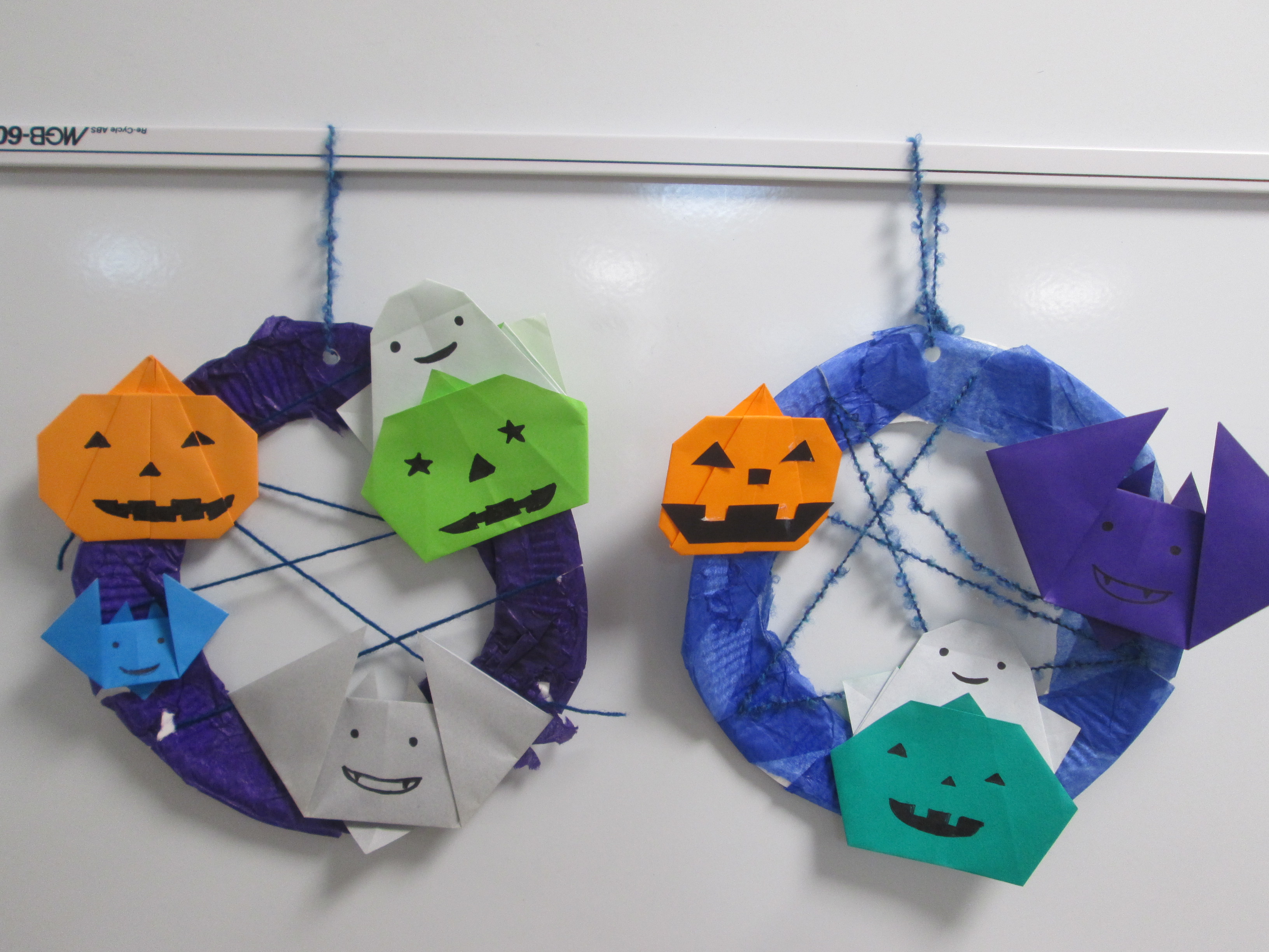 紙皿を土台にして、蜘蛛の巣のように毛糸を絡ませそこへ折り紙のかぼちゃやコウモリなどを貼りつけて行きます。