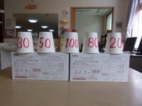 点数の書かれた紙コップに割り箸で作られた鉄砲に輪ゴムをつけ、もちろん狙うのはど真ん中、100点!
